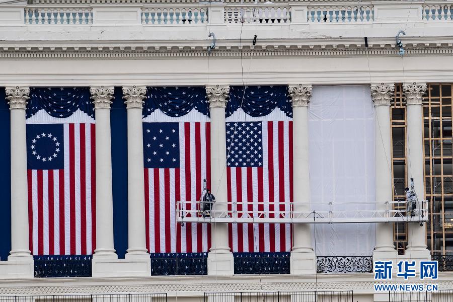 1月11日,在美国首都华盛顿,工作人员在国会大厦外悬挂旗帜,为下届总统的就职典礼做准备。新华社记者 刘杰 摄