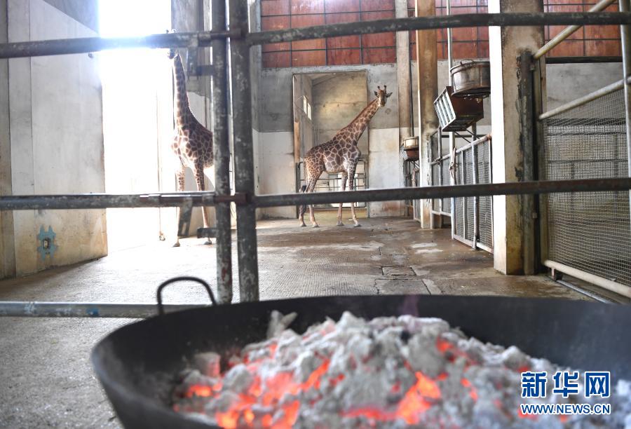 1月12日,南宁市动物园给长颈鹿饲养室里增加炭火盆,以保证它们温暖越冬。