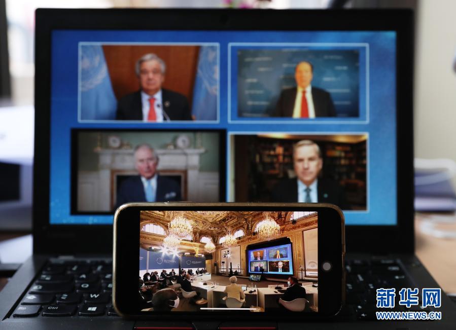 这张1月11日在法国巴黎拍摄的照片显示,电脑和手机上正在播出“一个星球”峰会在巴黎爱丽舍宫的视频会议现场画面。