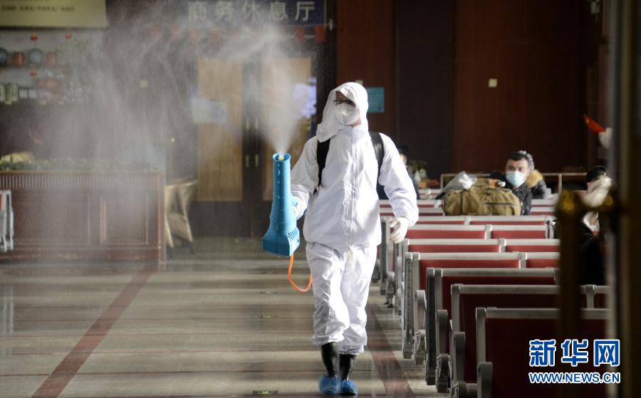 1月12日,北京站防疫人员对候车室进行每4小时一次的防疫消杀。