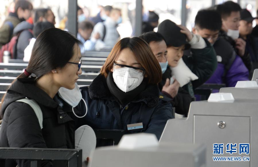 1月12日,北京站工作人员(左二)在检票口人脸识别系统前进行防疫间隔疏导。