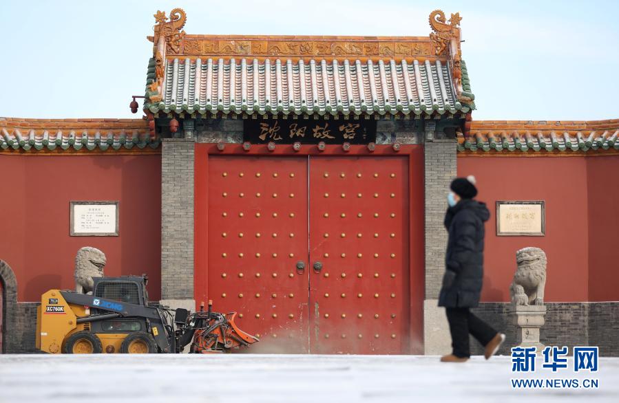 1月13日,一辆除雪车在沈阳故宫宫门前除雪。新华社记者 姚剑锋 摄