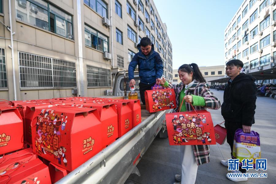 1月13日,在位于诸暨的全兴精工集团有限公司员工宿舍楼下,工作人员搬运过年礼包,准备送给宿舍的外地员工。
