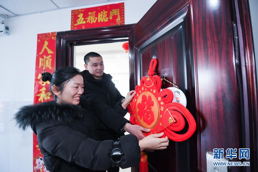 1月13日,在位于诸暨的全兴精工集团有限公司员工宿舍楼内,留下过年的安徽员工王睛(左)和丈夫邱奎在公司分配的家庭房里挂福字。