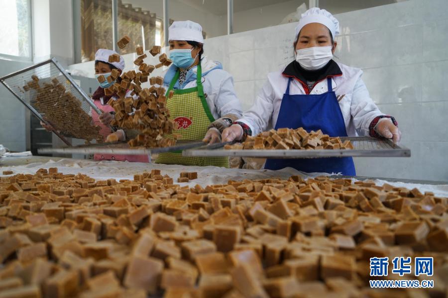 1月13日,在贵州省习水县隆兴镇淋滩村一家红糖加工作坊,工人在筛选糖片。