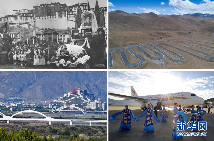 左下是青藏铁路列车抵达拉萨(2016年6月27日新华社记者普布扎西 摄);