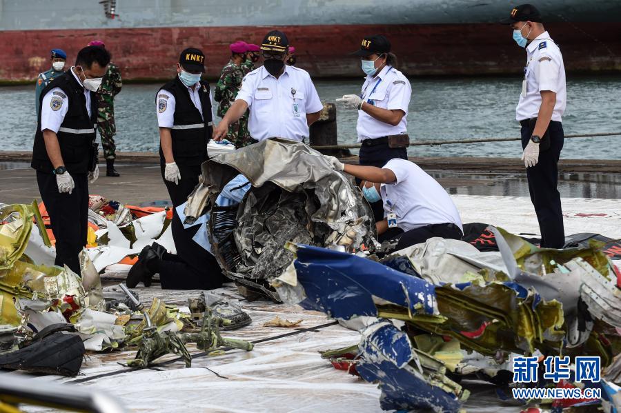 1月13日,搜救人员在印度尼西亚雅加达丹戎不碌港整理失事客机残骸。新华社发(阿贡摄)