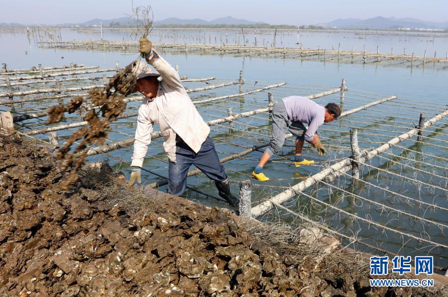 1月13日,广东阳西县程村镇红光村村民在收蚝。