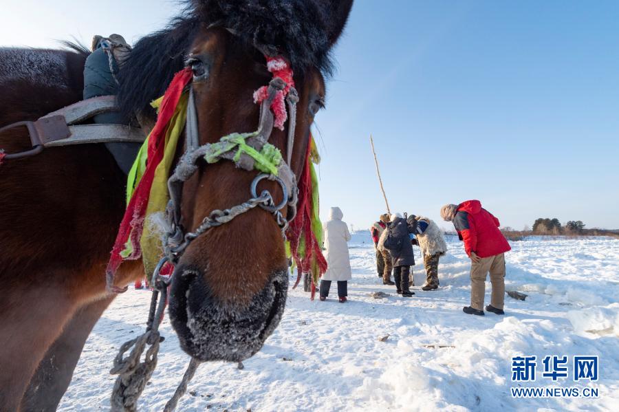 1月13日,在北极村,游客乘坐马拉爬犁游玩的中途体验冬捕。