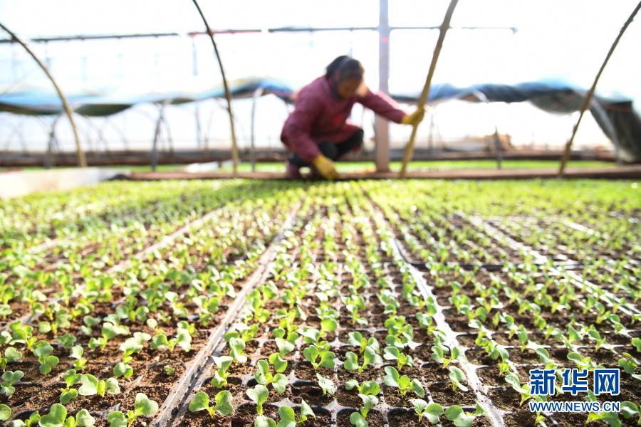 1月14日,河南省济源市王屋镇柏木洼村农民在柏木洼蔬菜制种基地的育苗温棚管理白菜苗。