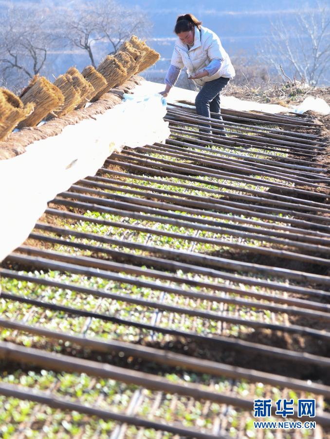 1月14日,河南省济源市王屋镇柏木洼村农民在柏木洼蔬菜制种基地的塑料棚苗床管理白菜苗。