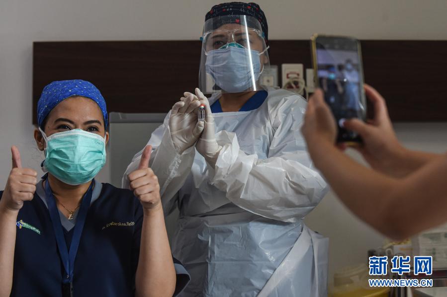 1月14日,在印度尼西亚雅加达的一家医院,一名医卫工作者(左)在接种中国科兴公司的克尔来福新冠疫苗前留影。
