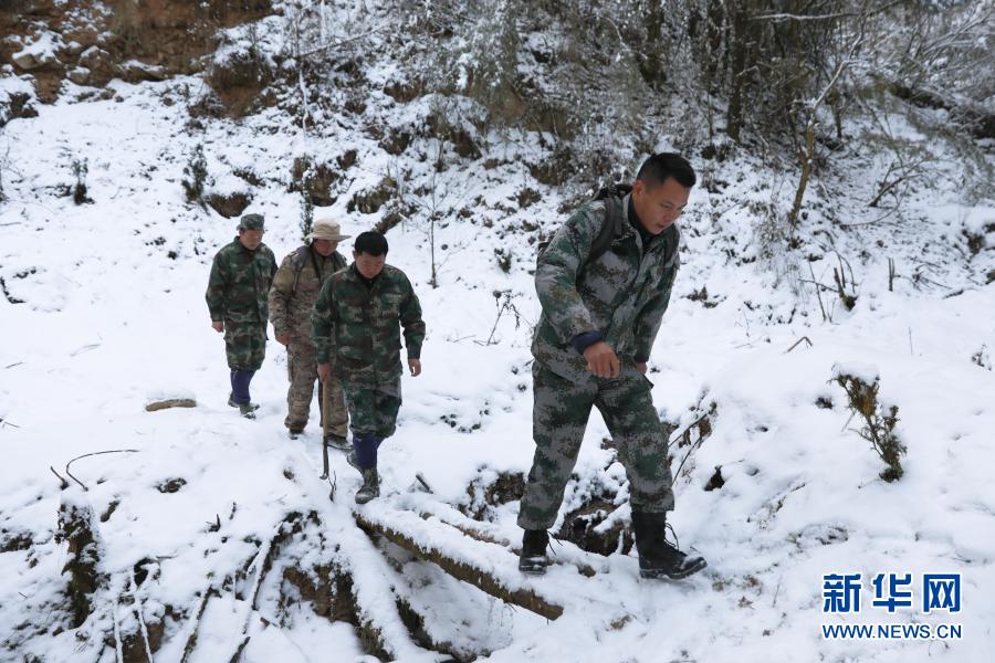 1月12日,在栗子坪国家级自然保护区内,石旭(前)与队友一同巡护。