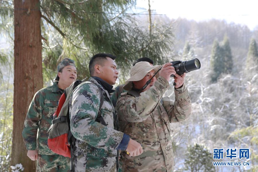 1月12日,在栗子坪国家级自然保护区,石旭(左二)与队友记录巡护途中发现的野生动物。
