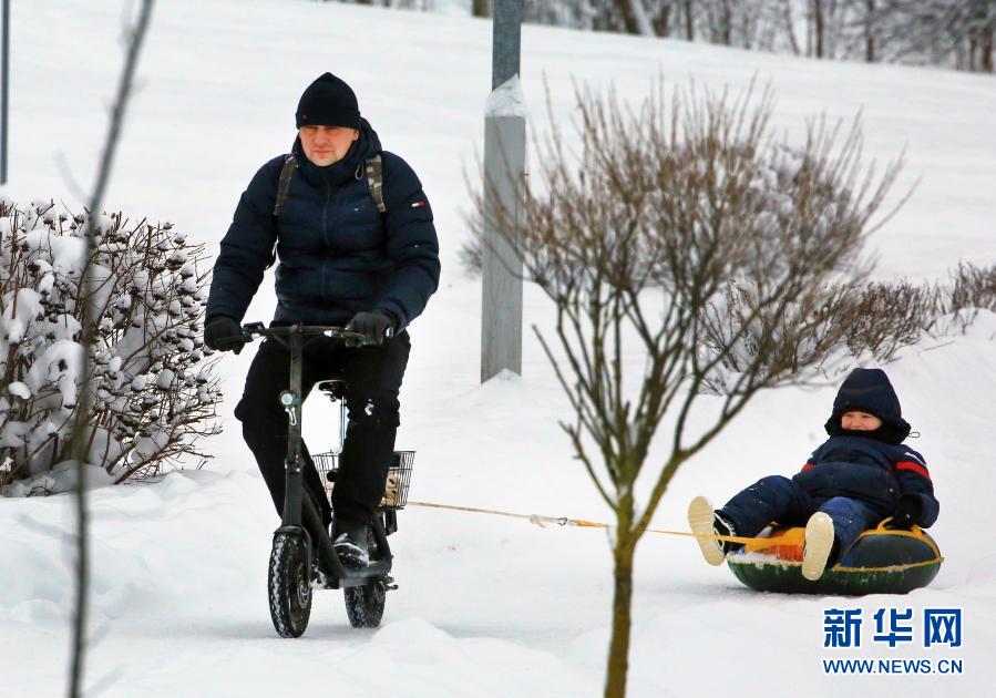 1月13日,人们在白俄罗斯首都明斯克一个公园玩耍。