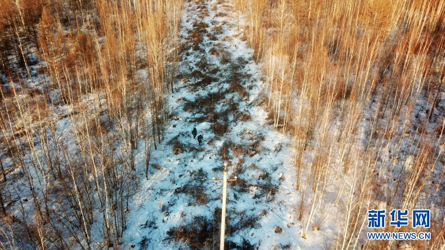 1月7日,国家电网呼中供电公司巡线检修工王殿辉和孙林波在执行“极寒特巡”任务的巡线途中(无人机照片)。新华社记者 王建威 摄