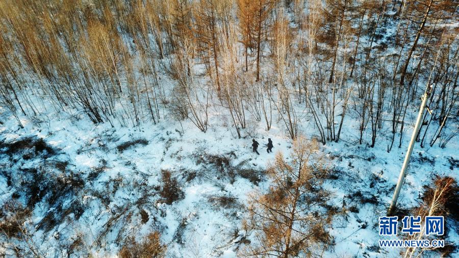1月7日,国家电网呼中供电公司巡线检修工王殿辉和孙林波在执行“极寒特巡”任务的巡线途中(无人机照片)。新华社记者 王建威 摄