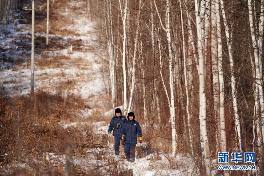 国家电网呼中供电公司巡线检修工王殿辉(左)和孙林波在查看线路情况途中(1月7日摄)。新华社记者 王建威 摄