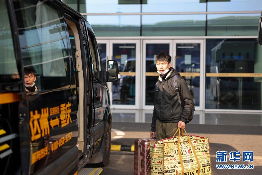 1月14日,重庆江北国际机场T3A航站楼的长途汽车站内,一名乘坐重庆江北国际机场至四川省达州市客运定制专线的旅客准备上车。