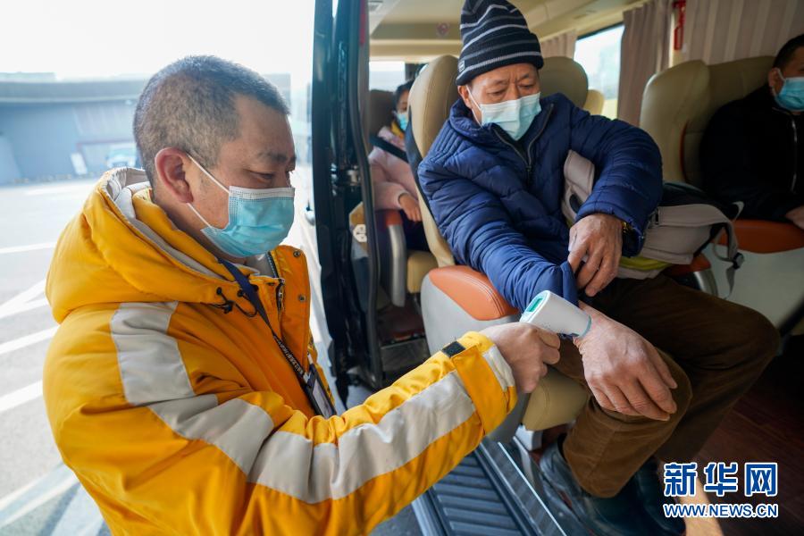 1月14日,重庆江北国际机场至四川省达州市客运定制专线的客运车辆出发前,工作人员在对乘车的旅客进行出发前的体温检测。