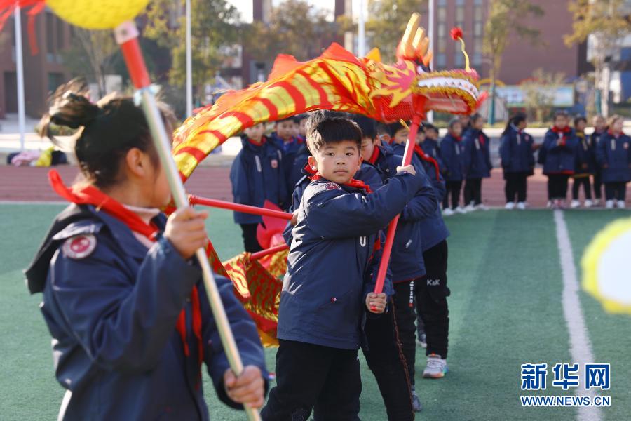1月14日,淮北市泉山路学校的学生在大课间练习舞龙。新华社发(万善朝 摄)