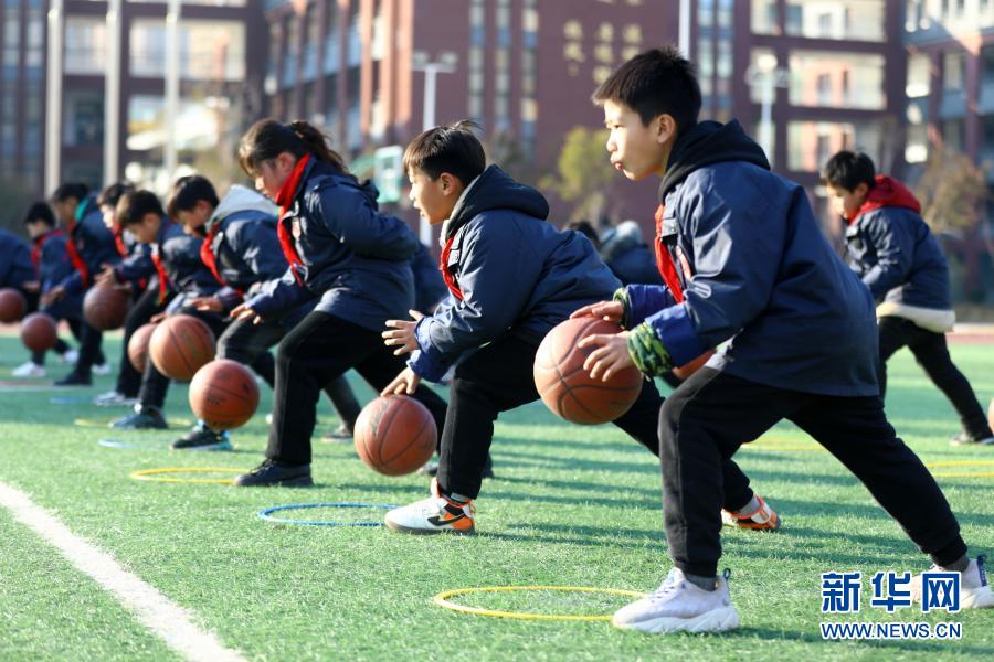 1月14日,淮北市泉山路学校的学生在大课间练习篮球基本动作。新华社发(万善朝 摄)