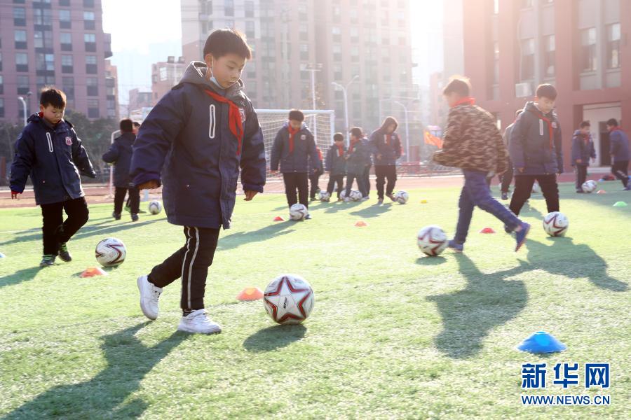 1月14日,淮北市泉山路学校的学生在大课间练习踢足球。新华社发(万善朝 摄)