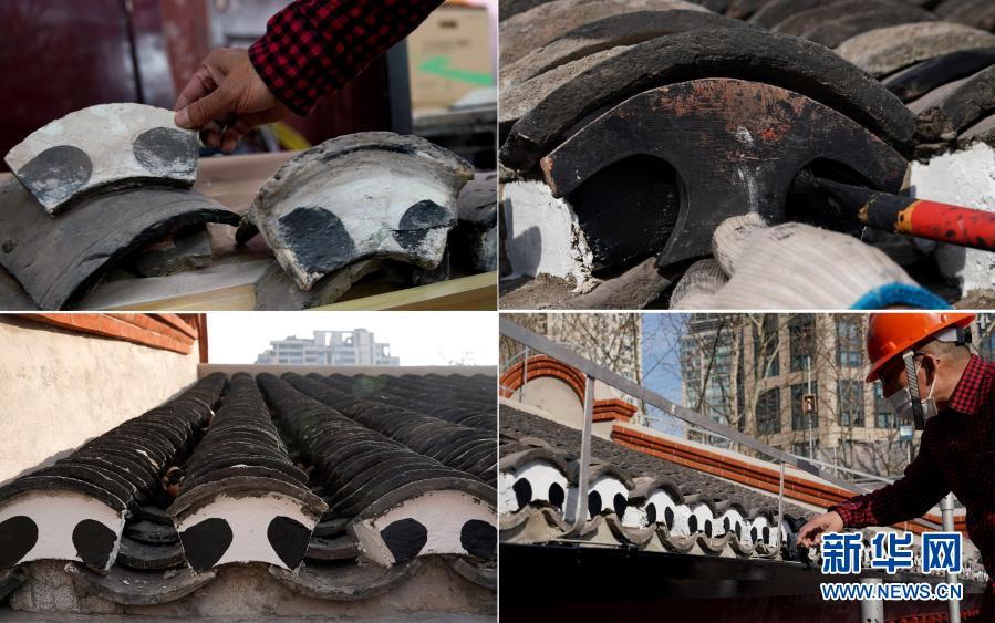 中共一大会址纪念馆建筑的瓦当独具特色:白底上有两个黑圈,被称为“熊猫眼”。这张拼版照片左上为工人拆下来的旧瓦当;右上为工人用工具修缮旧瓦当;左下为已铺好的新瓦当;右下为已铺好的新瓦当(1月14日摄)。