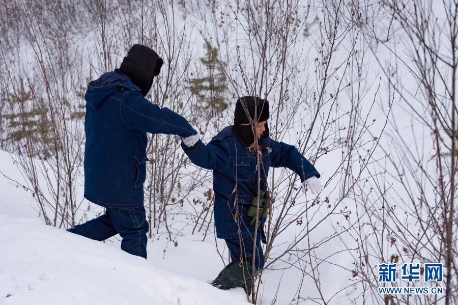 1月12日,北极供电所所长吕建生(右)和抄表员王少亭在漠河市北极镇北极村附近的山林中进行电力巡线。他们是中国最北的供电所——北极供电所里仅有的两名员工。