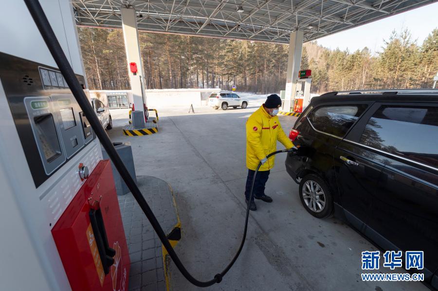 1月12日,在漠河市北极镇北极村,加油站工作人员在给车辆加油。