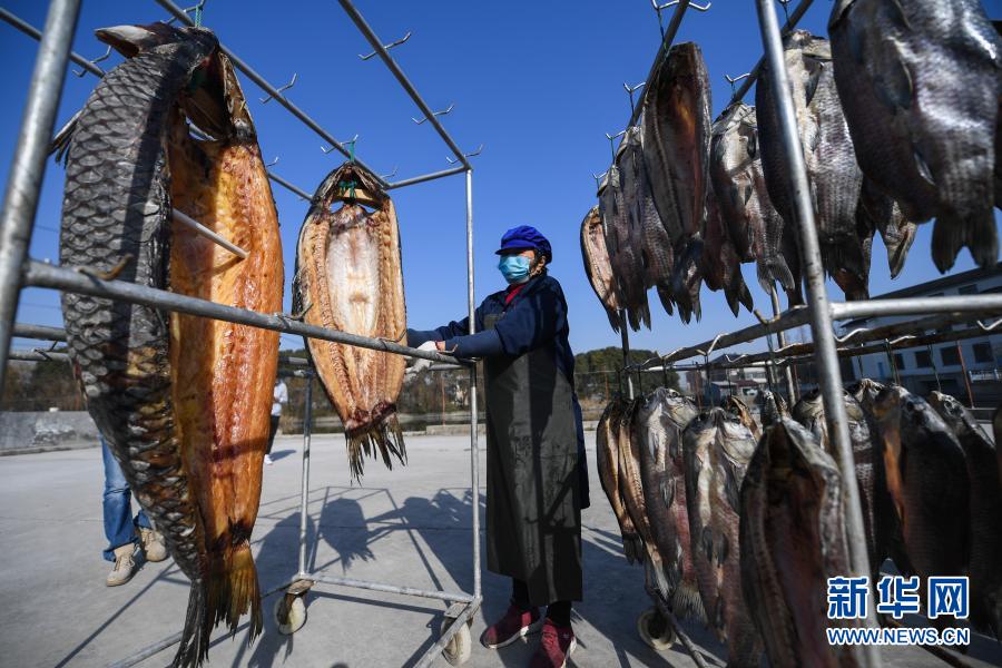 1月15日,在王江泾镇梅家荡渔业园区的青鱼加工厂内,工作人员在晾晒青鱼干。