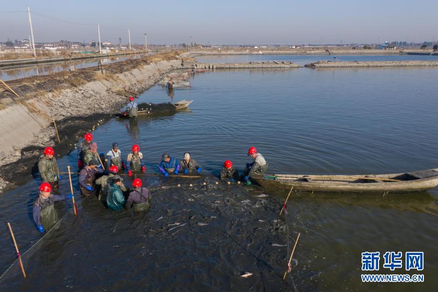 1月15日,在王江泾镇梅家荡渔业园区的养殖塘内,养殖户在收网捕鱼,这一网捕捞的青鱼有7万多斤(无人机拍摄)。从早上6点多钟开始下网、收网、捕捞,整个过程要用3个多小时完成。