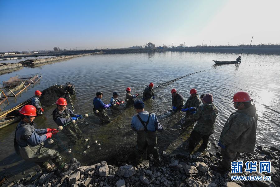 1月15日,在王江泾镇梅家荡渔业园区的养殖塘内,养殖户正在收网捕鱼,这一网捕捞的青鱼有7万多斤。