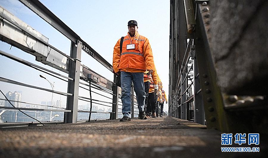 柳州工务段柳州路桥检查工区工人们进入柳江铁桥检修桥面(1月13日摄)。