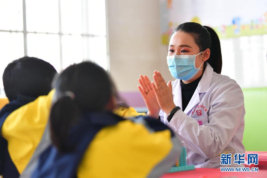 1月15日,岷县妇女儿童康养中心康复治疗师陈蓉蓉引导孩子们开展康复训练。