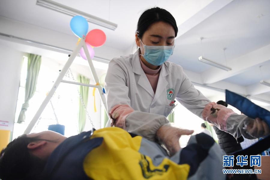 1月15日,岷县妇女儿童康养中心康复治疗师马婷婷在给孩子做康复训练。