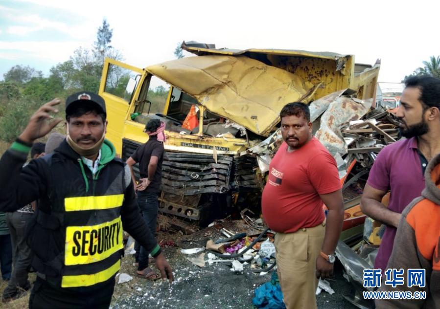 1月15日,在印度西南部卡纳塔克邦,救援人员在车祸现场工作。新华社发