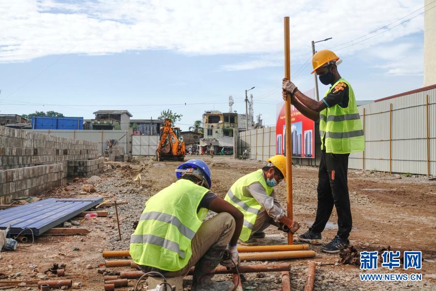 1月14日,在斯里兰卡科伦坡,工人们在保障房项目现场进行施工。新华社记者 唐璐 摄