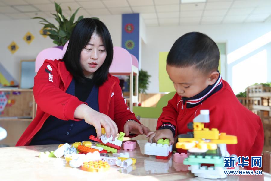 1月6日,甘肃省白银市会宁县第六幼儿园的教师陪孩子做游戏。新华社记者 马希平 摄