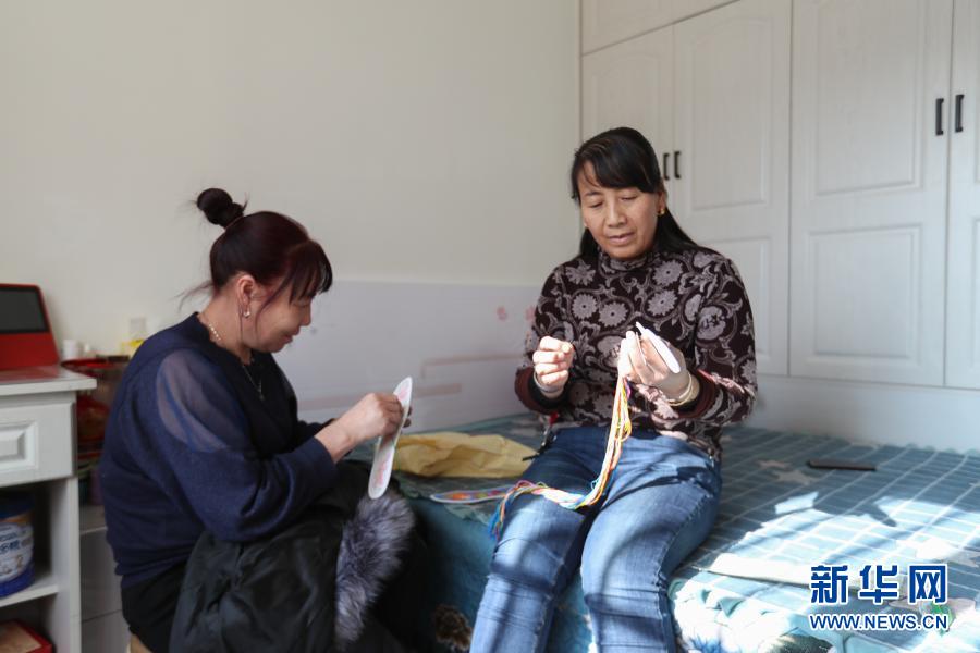 1月6日,在甘肃省白银市会宁县钟鼓楼安置小区,王兴瑞(右)在家里和朋友绣鞋垫。新华社记者 马希平 摄