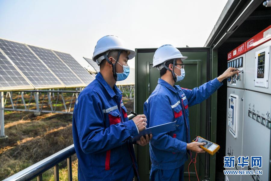 1月15日,在广西桂平市蒙圩镇玉柴农光互补光伏发电项目,工作人员在检查设备。新华社记者 曹祎铭 摄