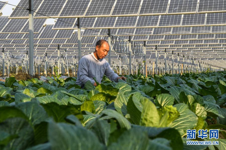 1月15日,在广西桂平市蒙圩镇玉柴农光互补光伏发电项目,村民在查看蔬菜长势。新华社记者 曹祎铭 摄