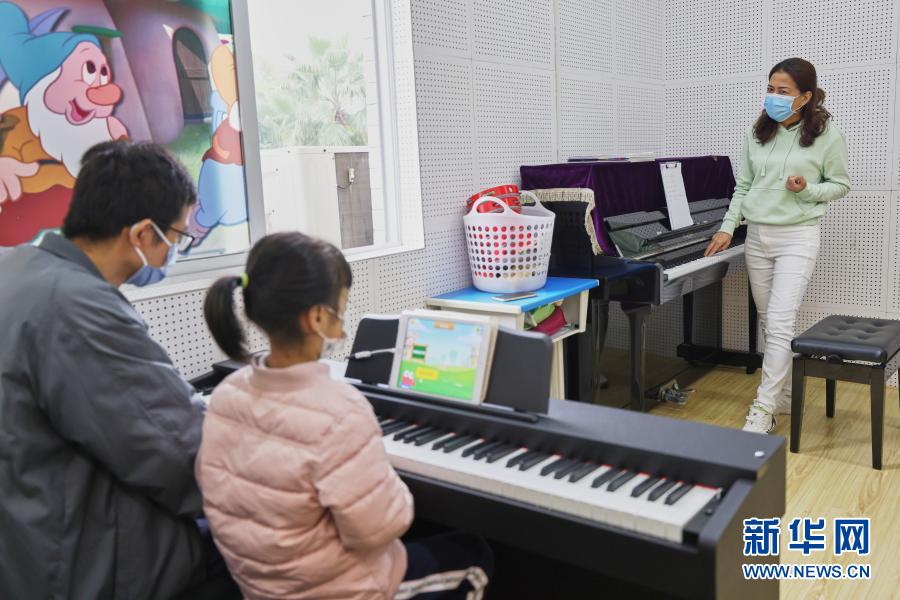 1月16日,孩子在家长陪伴下在海南(海口)青少年活动中心参加公益钢琴课。
