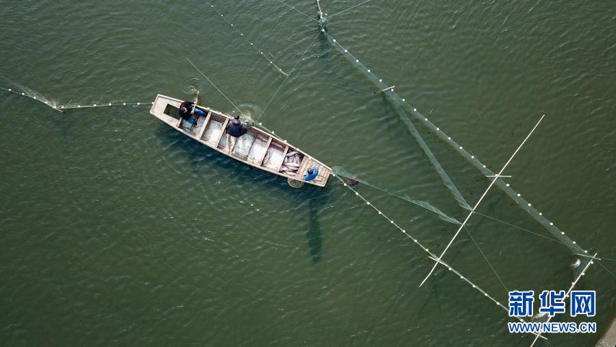 1月15日,在湖南省益阳市资阳区黄家湖渔场,工作人员在布置渔网(无人机照片)。