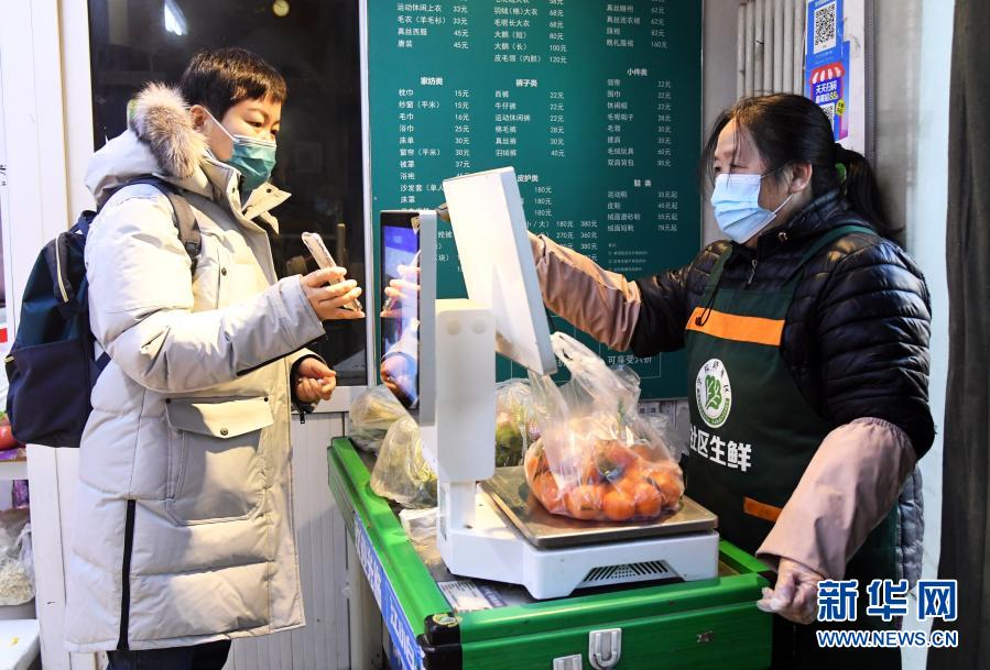 1月16日,在北京市海淀区学院路街道学清苑社区便民超市,社区居民在结账。