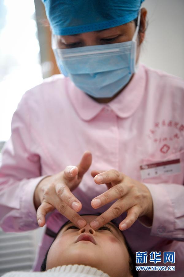 宁夏中医医院暨中医研究院的一名护师在为患儿推拿(1月15日摄)。