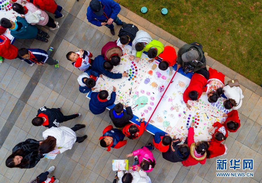 1月16日,参加乐考嘉年华活动的小学生在一起画画(无人机照片)。