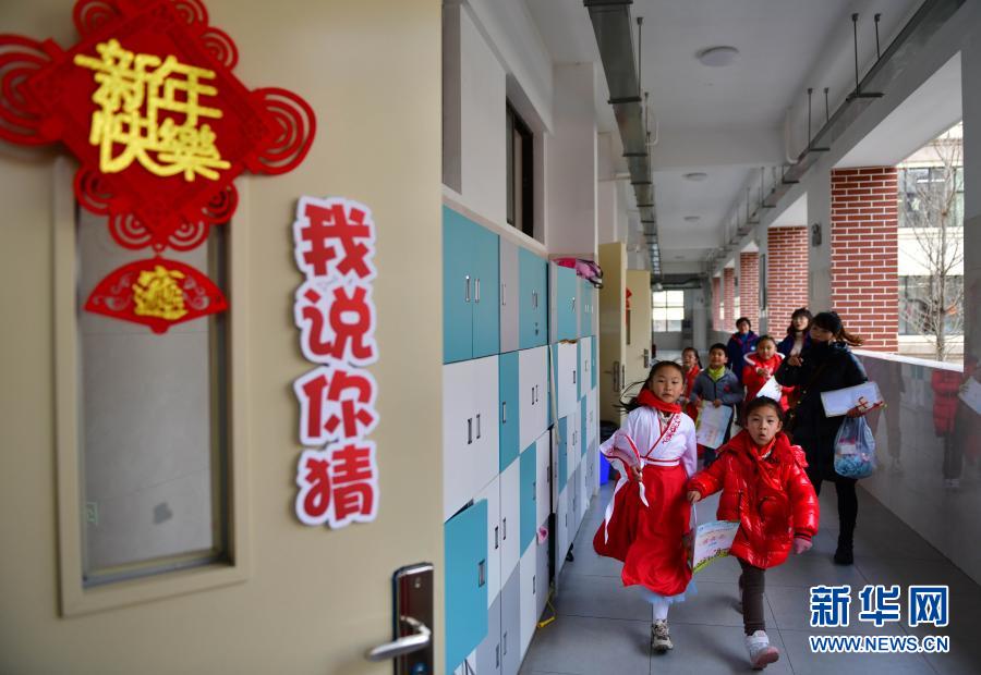 1月16日,参加乐考嘉年华活动的小学生拿着闯关卡准备去闯关。
