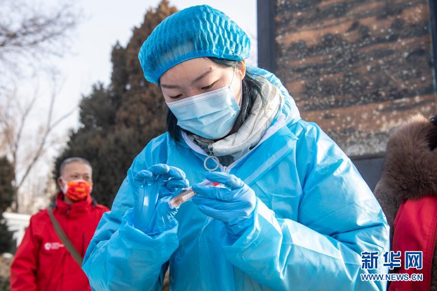1月14日,在山西省晋中市榆次区锦纶街道核酸采样点,志愿者李泽华为采样试管贴标签。新华社记者 杨晨光 摄