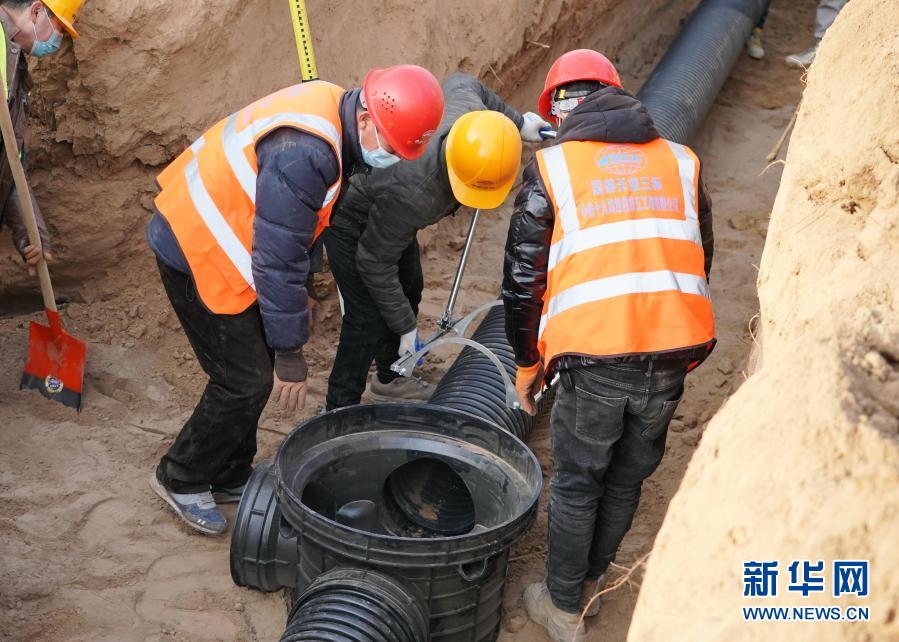 1月16日,工人在石家庄黄庄公寓隔离场所项目工地安装排水管道。